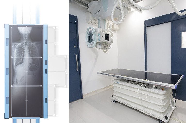 背骨の変形や姿勢のチェックでは、1回の撮影で脊椎全体を撮れるOneshot長尺システム(コニカミノルタ社製)を使用しており、レントゲン被曝量を低減しながら、情報量の多いX線診断が可能となっています。