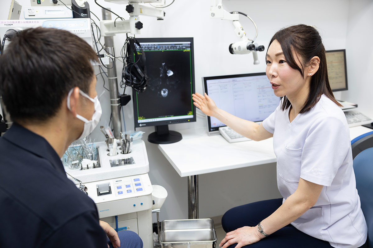 聴こえにくさは、慢性中耳炎や耳垢などによって起こっていることもあります。そのため、内視鏡や顕微鏡などを用いて耳の中を精密に調べます。 疾患や耳垢の問題がなければ純音聴力検査を行って補聴器の適応について確認します。
