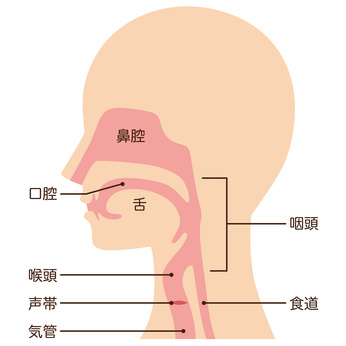 のどは、口のすぐ奥にある咽頭、のど仏周辺にある息の通り道の喉頭に分けられます。口腔と咽頭・喉頭、鼻腔はのどの部分でつながっていて、呼吸、物を飲み込む嚥下、発声などの役割を担っています。咽頭は空気や飲食物を受け入れる部分で、上咽頭・中咽頭・下咽頭に分けられます。上咽頭は鼻呼吸、中咽頭は呼吸と嚥下、下咽頭は嚥下を行う部分です。喉頭は呼吸の空気を気管に、飲食物を食道に振り分け、発声のための声帯を備えています。